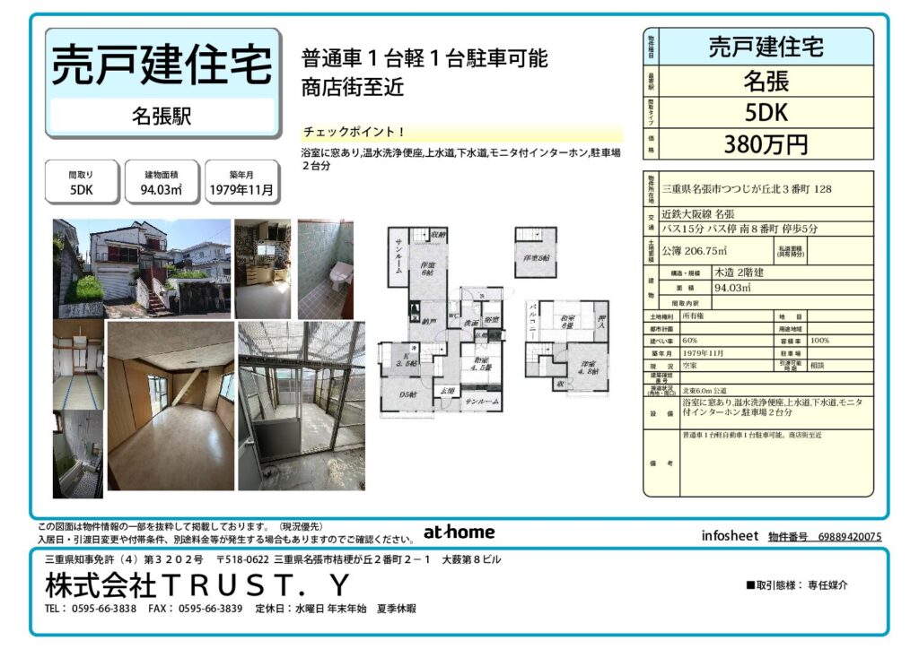 名張市つつじが丘北3にある中古住宅です。つつじが丘商店街至近。普通車1台計1台駐車可能。5DK