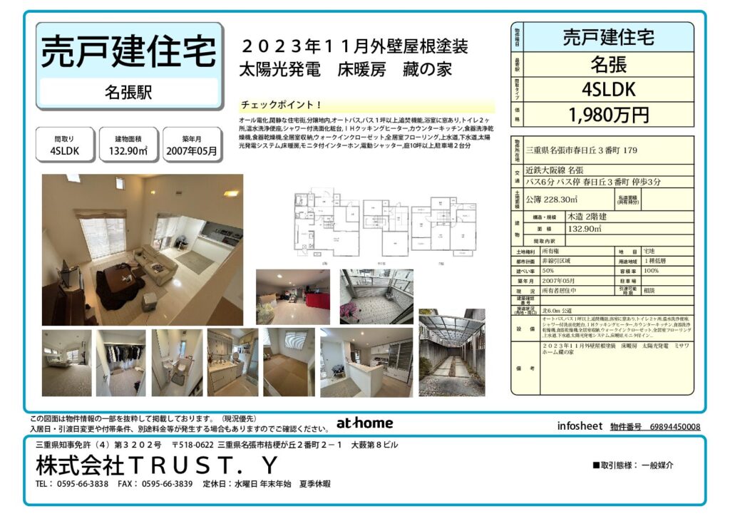 名張市春日丘3にあるミサワホーム藏の家、駐車場2台、床暖房の家です。 |